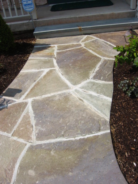 This Bridgewater, NJ residence enjoyed a renovation of the front landscape including boulder outcroppings, lush cottage-style plantings, and a natural stone path.