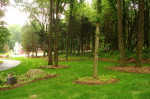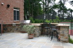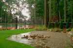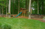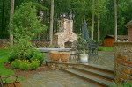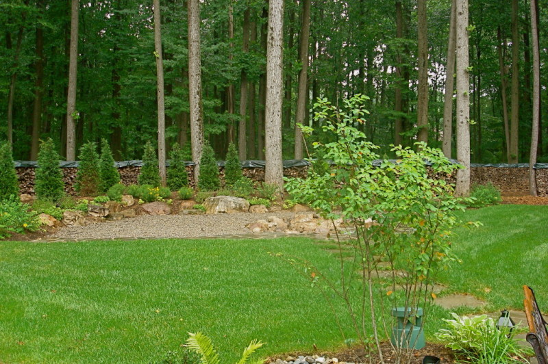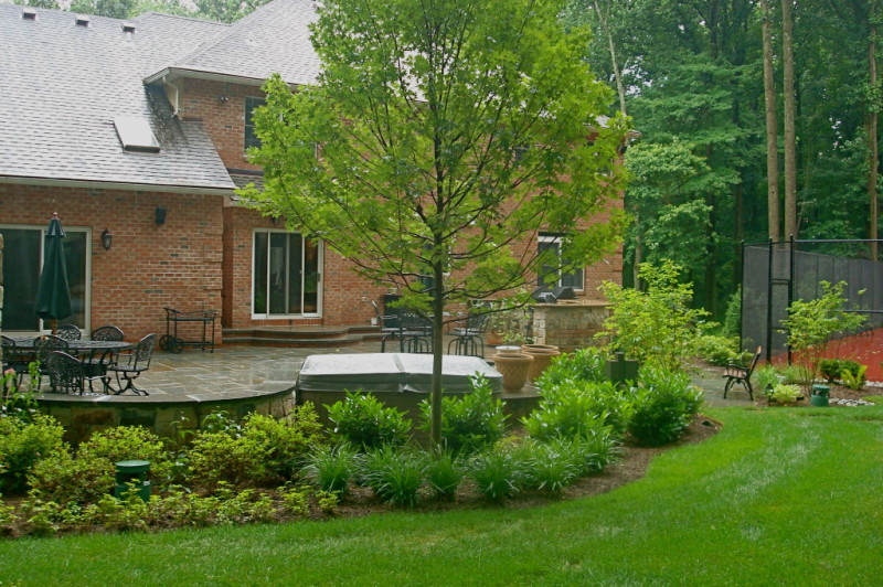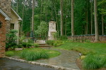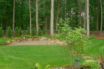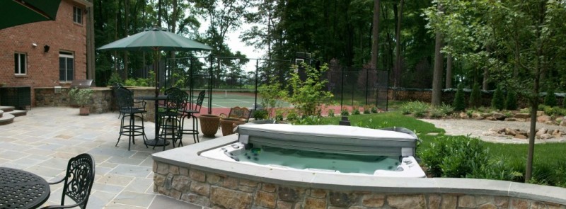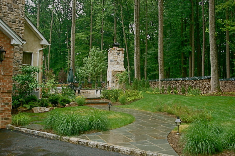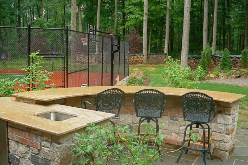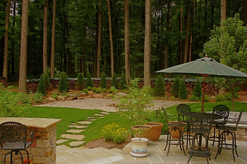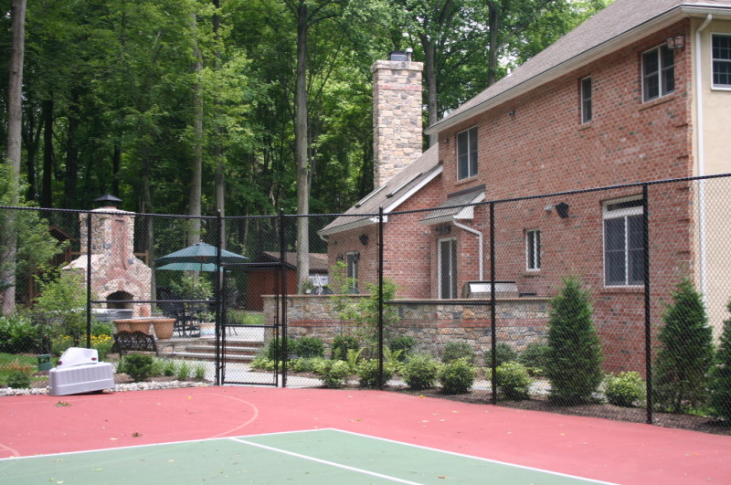 This Lebanon, NJ property experienced a complete overhaul; the small deck and crumbling walkway gave way to the ultimate in great outdoors. The design for this property began with a front yard face lift featuring defined lawn areas, a custom front portico with 16’ columns, stone steps, a recycled brick walkway and full floral planting. The backyard was refreshed with a raised stone patio and fireplace, built in hot tub, and a custom stone bar and grill. A large sunken fire pit and patio is encompassed by a boulder sitting garden at the edge of a stepping stone path. The entertainment area is set against a woodland backdrop with a full size tennis court tucked amongst mature plantings and trees.