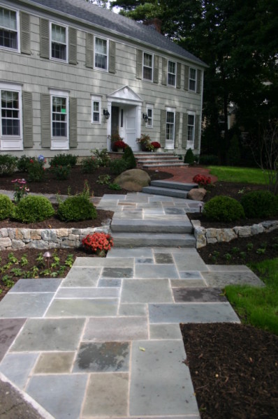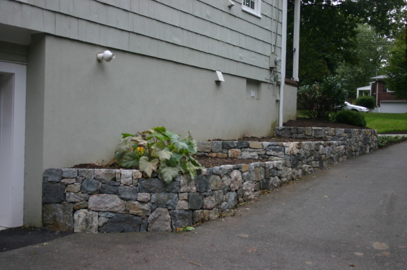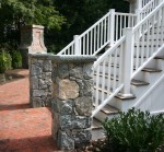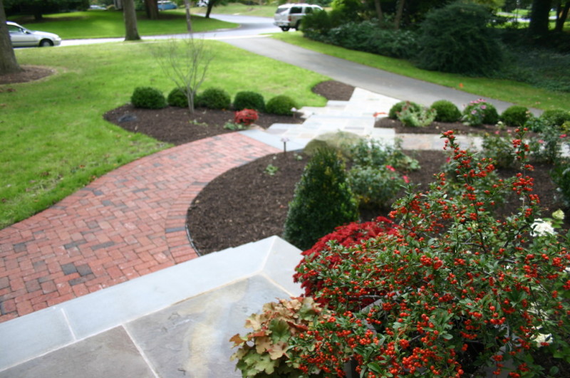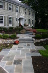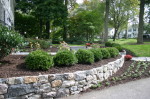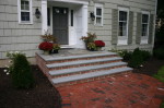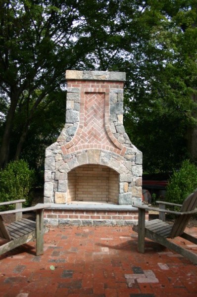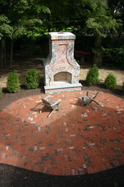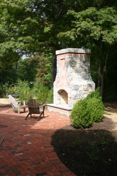 During an interior renovation of this center hall colonial in Summit, the homeowners decided that the exterior of the home also needed updating. The first phase of this landscape design includes a brand new front garden featuring a brick a stone walkway and historically accurate plantings. The classic design is encompassed by a granite stone wall. The first phase extended into the backyard, where a small brick patio was designed and built to feature a custom granite fireplace and stone pillars. Two rain gardens were constructed adjacent to the patio to collect runoff and two drywells were buried in the yard to capture rainwater from the roof downspouts. Future phases for this property include a custom pool, entertainment patios and a cabana.